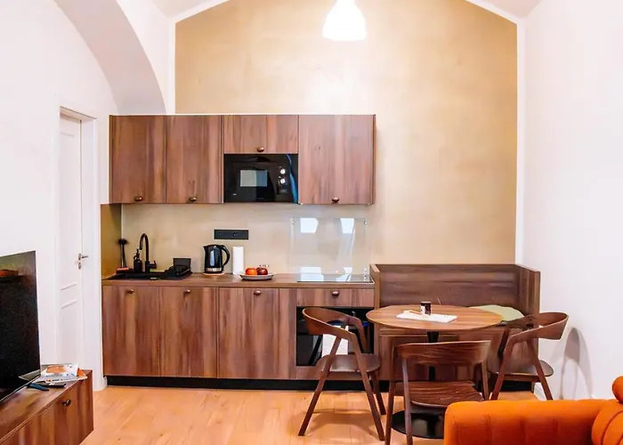 Cozinha totalmente equipada no Amber Nest In The Heart Of Prague Apartamento inclui forno e máquina de lavar loiça. Este apartamento está com fácil acesso para da paragem Myslikova.
